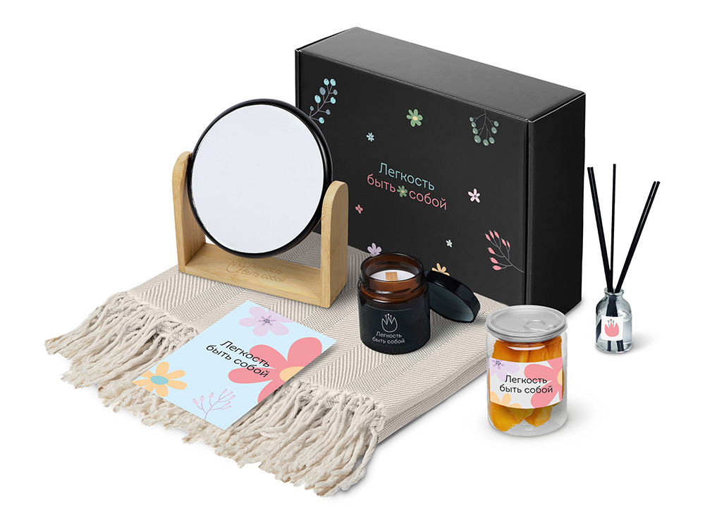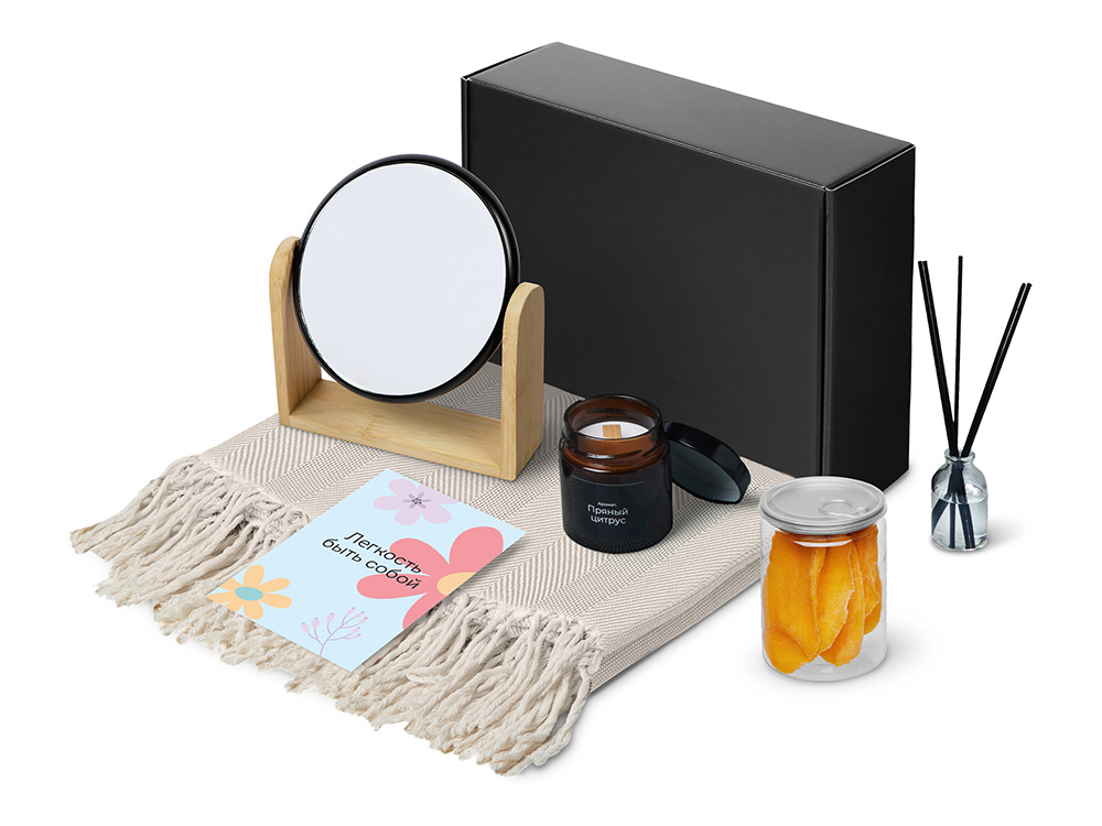 | Материал | плед — 100% хлопок, свеча — стекло, мешок — нетканый материал (спанбонд), коробка — картон, зеркало — бамбук, пластик, стекло, манго -пластик, диффузор — стекло |