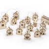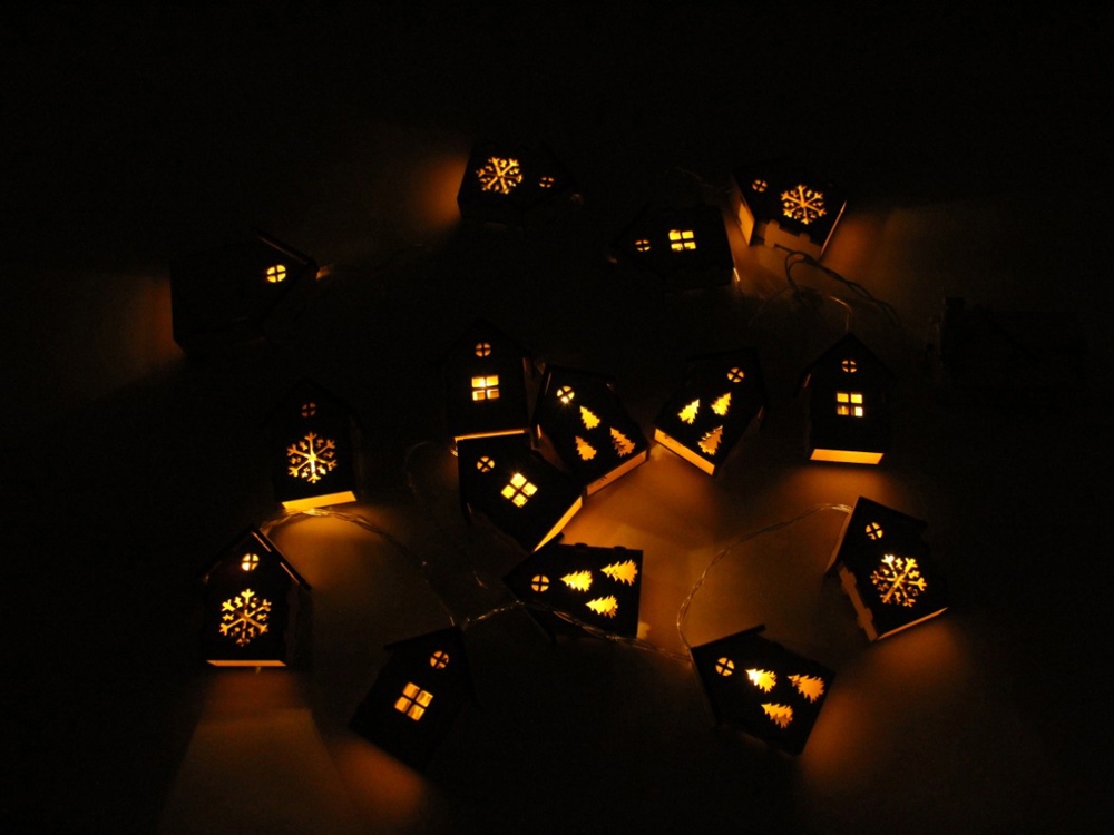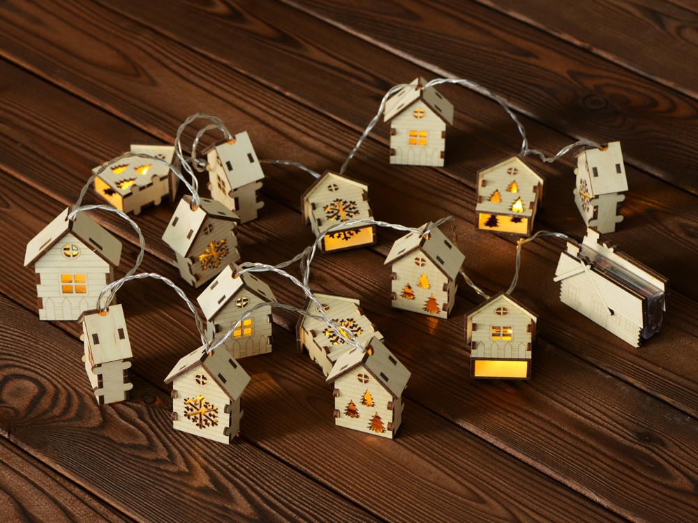 Светодиодная новогодняя елочная гирлянда постоянного свечения с домиками из натуральной березовой фанеры. Работает от 2-х батареек АА (в комплекте).