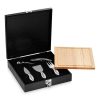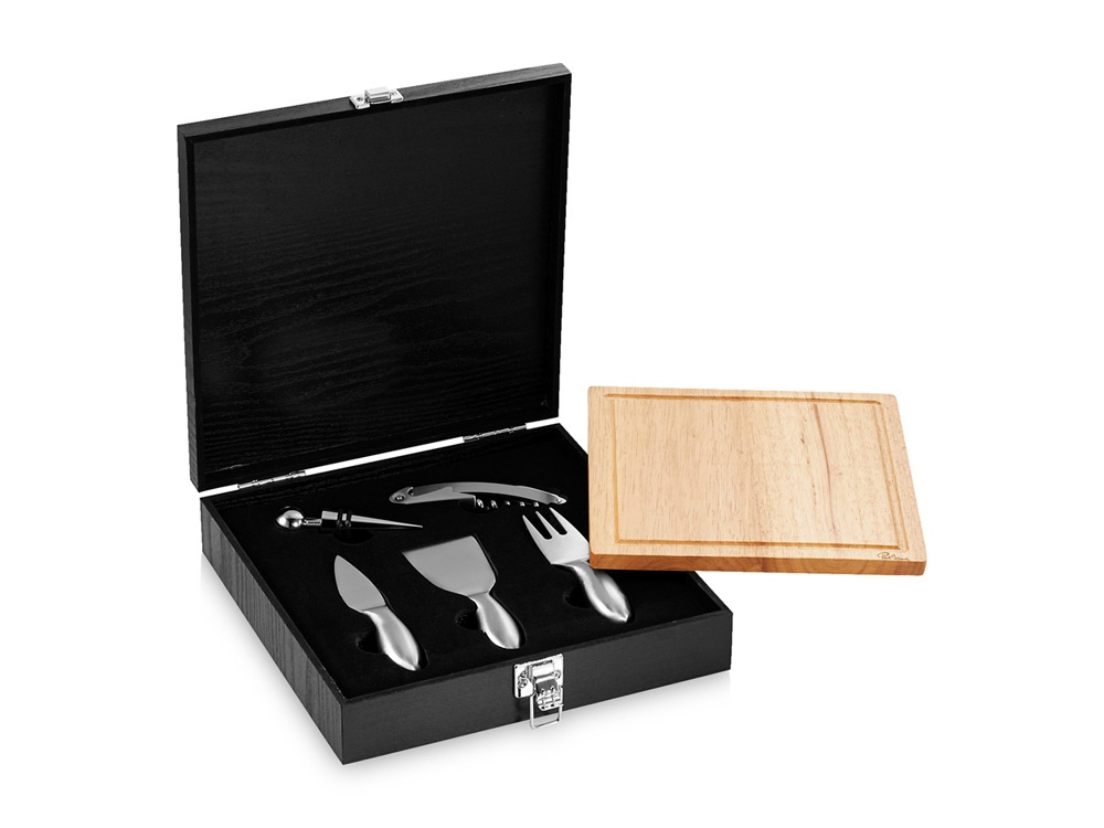 Набор для сыра и вина Mino. В этот набор из 6-ти предметов входит деревянная разделочная доска, три ножа для мягкого сыра, твердого и зрелого сыра, стоппер для вина и штопор. Набор предлагается в деревянной подарочной коробке с шильдом 40 х 25 мм для лого.