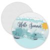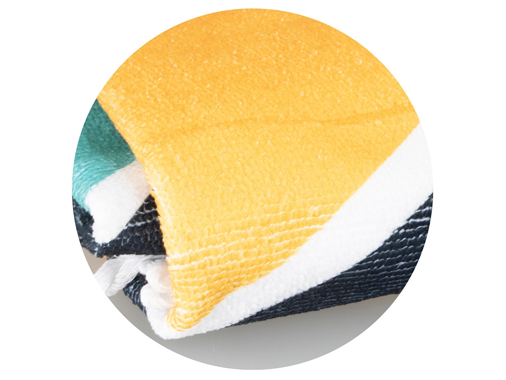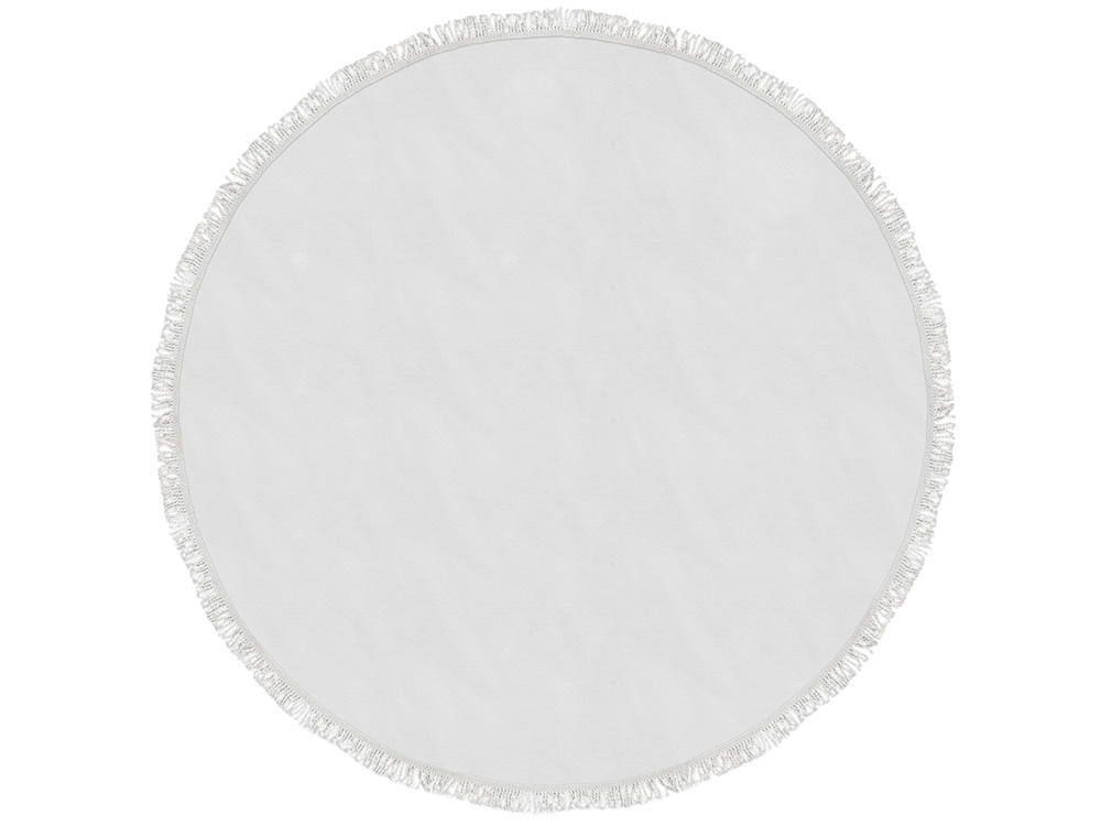 Необычный и трендовый вариант классического пляжного аксессуара. Круглая форма полотенца помогает быстро и удобно расстилать его на земле или шезлонге. Плотный полиэстер сохнет быстрее обычных тканей, поэтому полотенцу не требуется дополнительная упаковка после использования — достаточно ненадолго развесить его для просушки. Полноцветная печать на полотенце производится с помощью сублимации. Бахрома по краю может быть изготовлена в двух цветах (белый и чёрный) на выбор клиента.