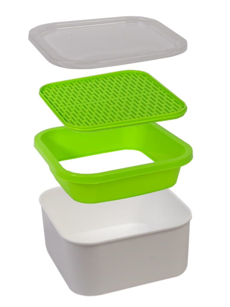 Проращиватель для выращивания микрозелени (при изменении положения решетки может использоваться для проращивания проростков).Микрозелень – молодые растения в фазе пары первых листьев, содержащие максимальную концентрацию полезных веществ. Растет на чистой воде за счет использования внутренних ресурсов семян. Комплектация набора: — крышка, — корзинка, — сменное дно (установленное в позицию для проращивания микрозелени), — емкость для жидкости. Проращиватель подходит как для крупных семян, так и для самых мелких. Для выращивания микрозелени установите сменное дно широкими бороздами вверх. Для проростков — широкими бороздами вниз. Как вырастить микрозелень: Шаг 1. Установите сменное дно стороной для микрозелени. Шаг 2. Налейте воду комнатной температуры в емкость для жидкости. Вода должна соприкасаться со сменным дном корзинки. Шаг 3. Насыпьте семена на сменное дно. Увлажните их пульверизатором. Шаг 4. Закройте крышкой на 1-2 дня. После появления первых всходов снимите крышку. Шаг 5. Микрозелень — молодые растения в фазе первых двух листьев. Через 7-14 дней снимайте урожай.