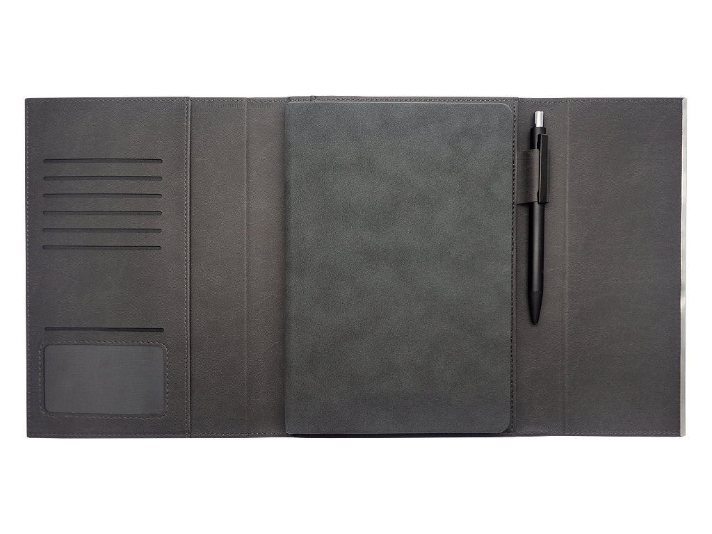 В комплекте гибкий недатированный ежедневник в обложке Nuba, имеющий прокрашенный срез и металлический шильд. По желанию заказчика ежедневник-портфолио может комплектоваться любым недатированным ежедневником из нашего ассортимента.