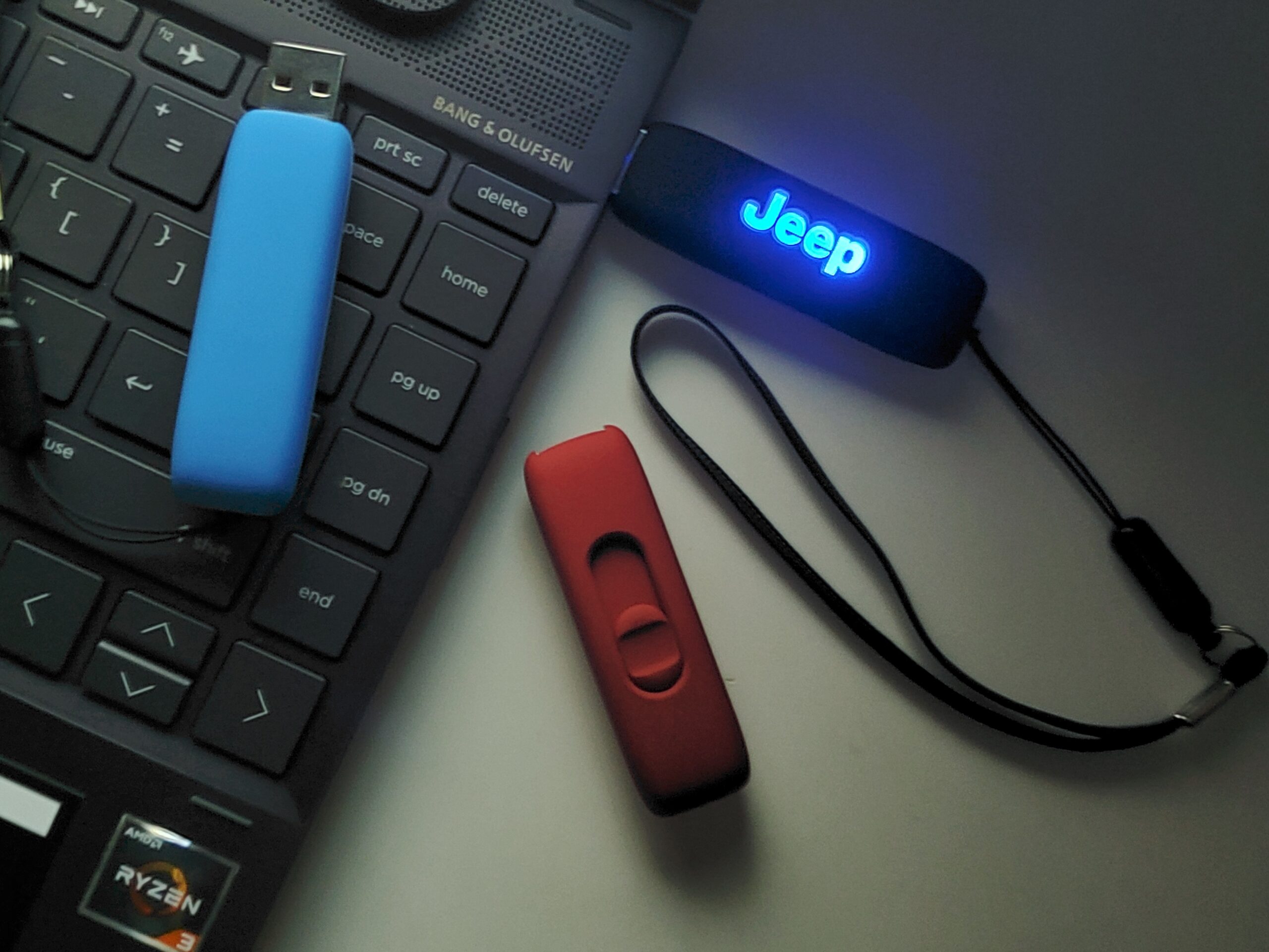 Классический флеш накопитель со съемным колпачком. Светится при подключении. Упаковка — зип пакет.