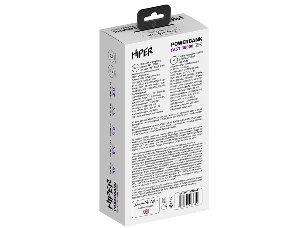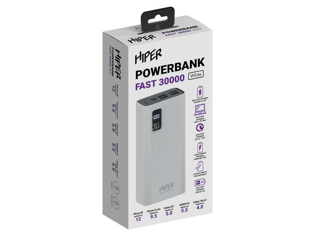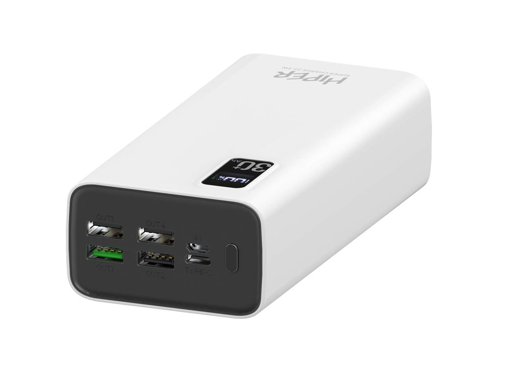 Портативный внешний аккумулятор HIPER FAST 30000 емкостью 30000 мАч (111Втч) оснащён двунаправленным портом USB-C, Micro-USB входом для зарядки, с поддержкой быстрой зарядки аккумулятора QC и PD, 4xUSB-A выходами, максимальный выходной ток 5А, максимальная мощность 22,5 Вт, поддержка быстрой зарядки стандарта QC 18 Вт, поддержка быстрой зарядки стандарта PD 18 Вт, стильный дизайн.