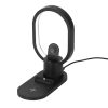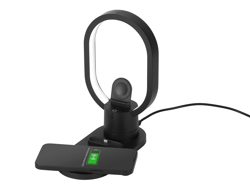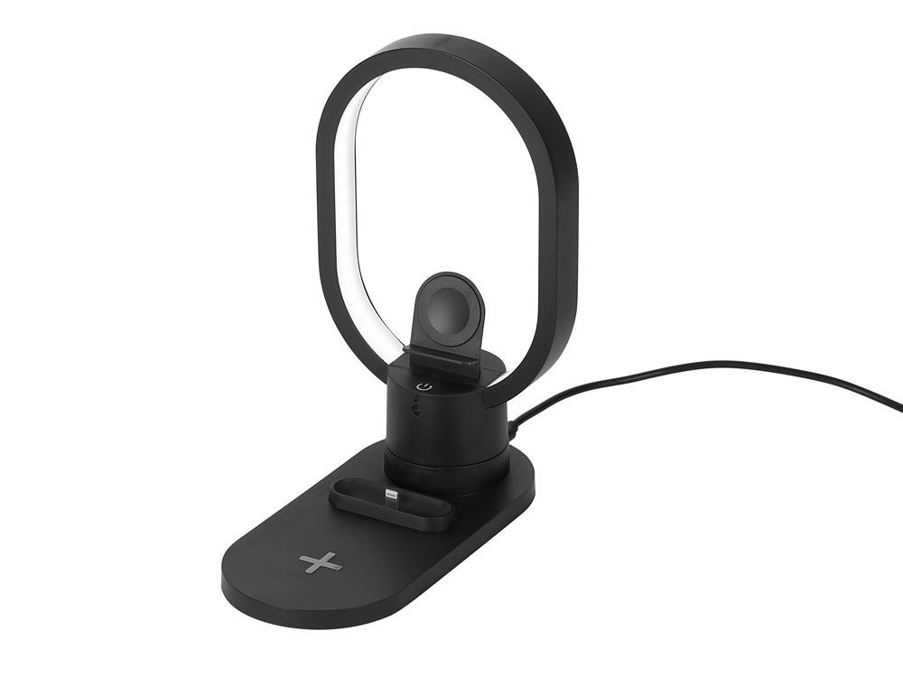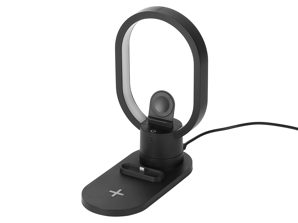 Настольная зарядная станция с лампой для трёх устройств — смартфона с поддержкой беспроводной зарядки, часов Apple и наушников Apple (разъем Lightning). Регулируемый уровень яркости (диммер). Лампу можно вращать вокруг своей оси. Для удобства транспортировки лампу можно отсоединить.