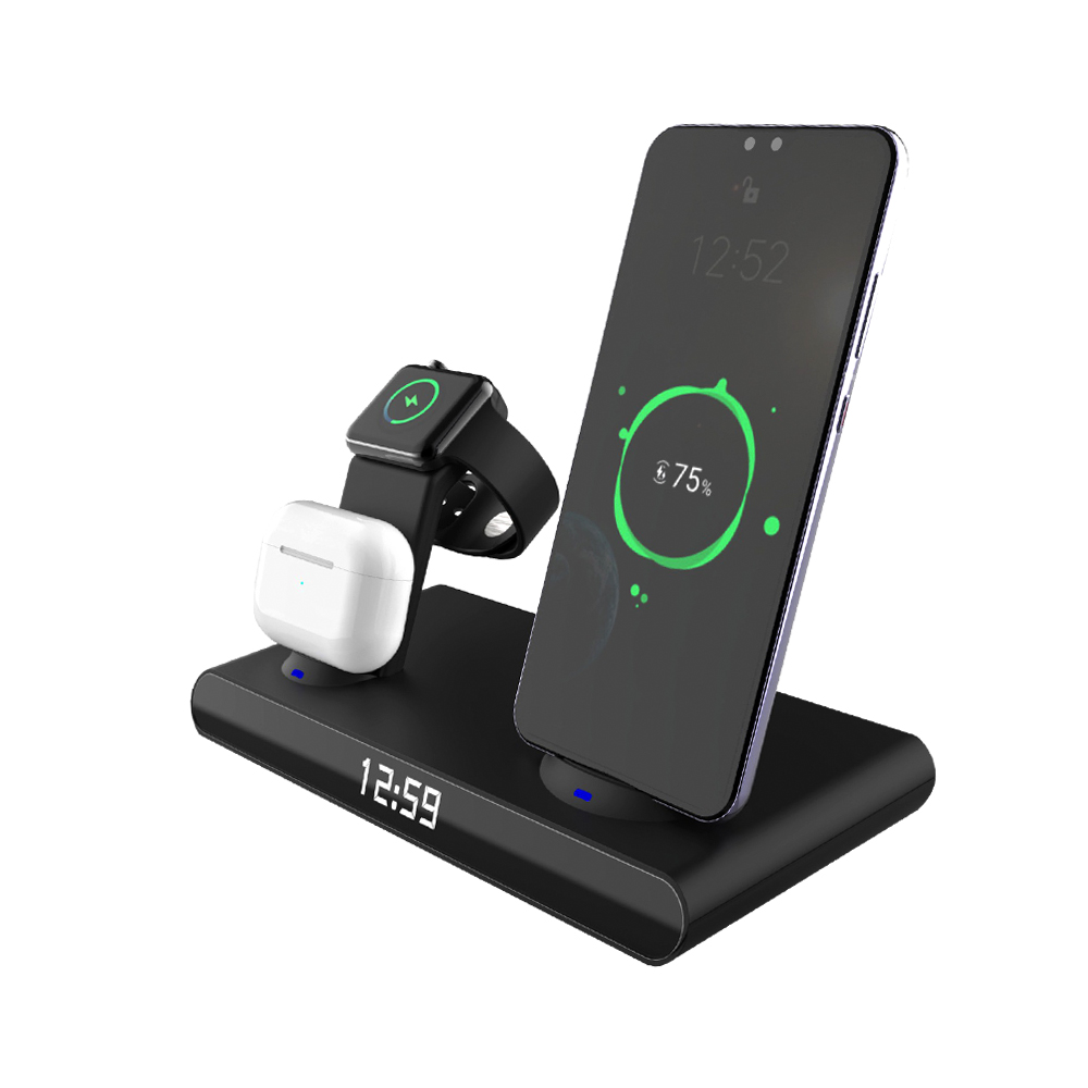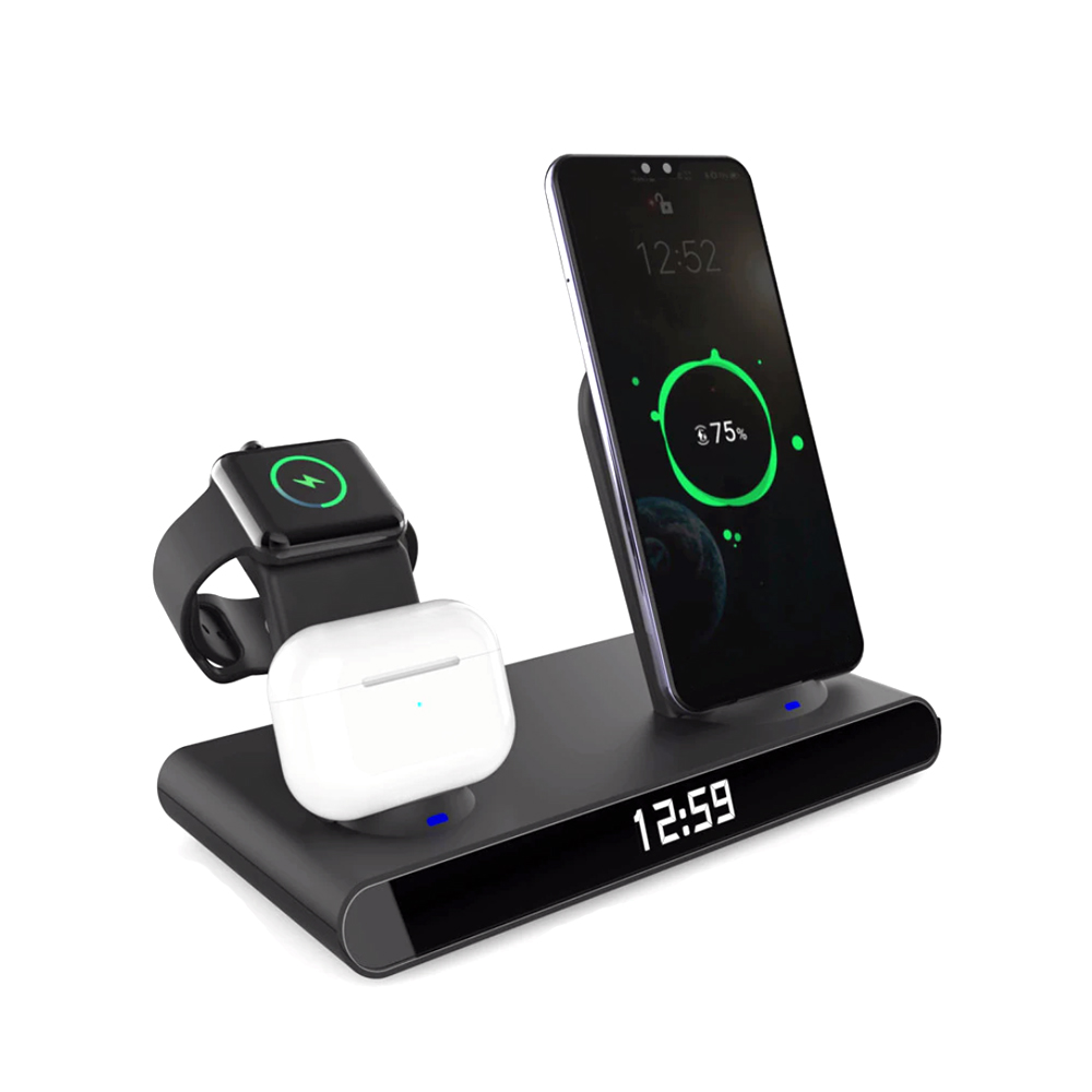 Часы электронные Abbatt мультифункциональные с беспроводной зарядкой. Особенность этих электронных часов заключается в том, что они выполянют функцию не только часов и будильника, а еще с их помощью можно заряжать свои гаджеты. Удобство беспроводной зарядки говорит само за себя — очень комфортно заряжать смартфон, часы и наушники, просто положив их на зарядную станцию, не подключая при этом к ним никаких кабелей. Также есть возможность быстрой зарядки Qi. При беспроводной зарядке устройство меньше подвержено перепадам в сети, чем при подключении к розетке, тем самым увеличивается срок службы аккумулятора. Благодаря интерфейсу Type-C (шнур идёт в комплекте 1м) ваши гаджеты будут заряжаться более эффективно, а главное — одновременно. Вы можете смотреть фильмы, слушать музыку, звонить или отправлять сообщения во время всего процесса зарядки. Входы: 9V/2A 12/2A. Выходы: Беспроводной 10W / 7.5W / 5W / USB 5V / 0.8-1A / Airpod 3W / Apple watch 2.5W