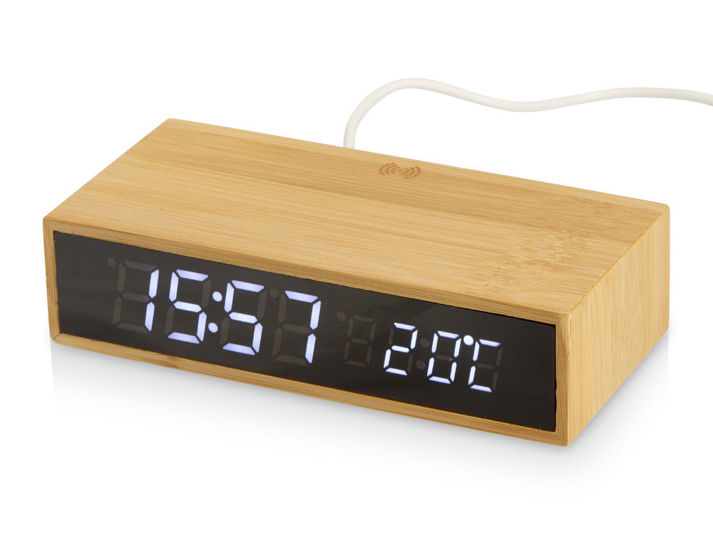 Настольные часы с корпусом из бамбука, имеют функцию беспроводной зарядки для смартфонов (10 Вт). Яркий дисплей. Функция измерения температуры окружающей среды.