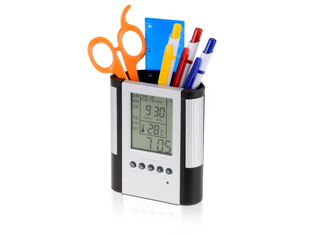 Чрезвычайно практичный элемент Вашего рабочего стола подскажет время, температуру и даже дату, а ещё вместит в себя канцелярские принадлежности. Часы оснащены будильником. Полный порядок на столе плюс комфорт за приемлемую цену.
