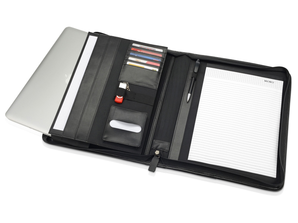 Функциональная и стильная папка для документов будет отличным подарком деловому партнеру. Выполнена из искусственной кожи, на корпус возможно нанесение оригинального тиснение или наложение шильда. Встроенный блок для записей. Удобные карманы для аксессуаров. Особенно удобно уплотненное отделение для планшета.