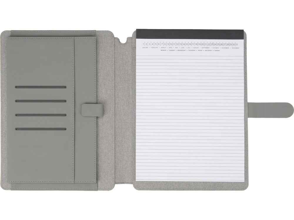 Стильная папка для документов формата А4 с комбинированной обложкой из текстиля и искусственной кожи. Удобный внутренний органайзер имеет карман на застёжке для планшета, блокнот для записей с линованной бумагой.