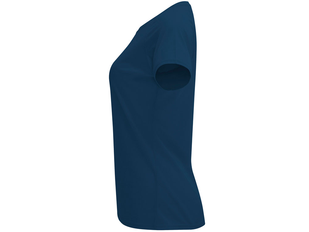 Спортивная футболка с коротким рукавом реглан для женщин. Круглый вырез горловины с отделкой плоским швом. Рукав сложного кроя для обеспечения дополнительного удобства при занятиях спортом. Отделка плоским швом с застилом по пройме и рукавам.