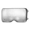 Прямоугольный автомобильный солнцезащитный козырек с алюминиевой передней частью и белой пенопластовой задней частью. Два металлических люверса в обоих верхних углах для присосок. Черная окантовка и эластичные лямки для складывания.