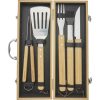 Набор для барбекю из 5 предметов из бамбука: лопатка (40 x 9,5 см), щипцы (34,5 x 6 см), вилка (38,5 x 3 см), нож (38,5 x 3 см) и щетка (38 x 4,3 см). Набор поставляется в подарочной коробке из бамбука (46 x 16,2 x 7,4 см). Ручки и подарочная коробка изготовлены из бамбука, который производится в соответствии со стандартами устойчивого развития.