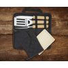 Набор для барбекю из 5 предметов: лопатка (29 x 7 см), вилка (29 x 1,7 см), нож (29 x 2,4 см), разделочная доска (19 x 13 x 1,1 см) и рукавица (25 x 16 см).