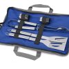 Набор включает в себя вилку, лопатку, щипцы, солонку и перечницу. Удобный чехол на замке-молнии позволяет компактно хранить составляющие набора. На чехол можно нанести изображение или надпись.