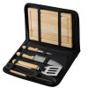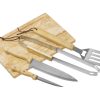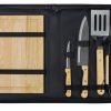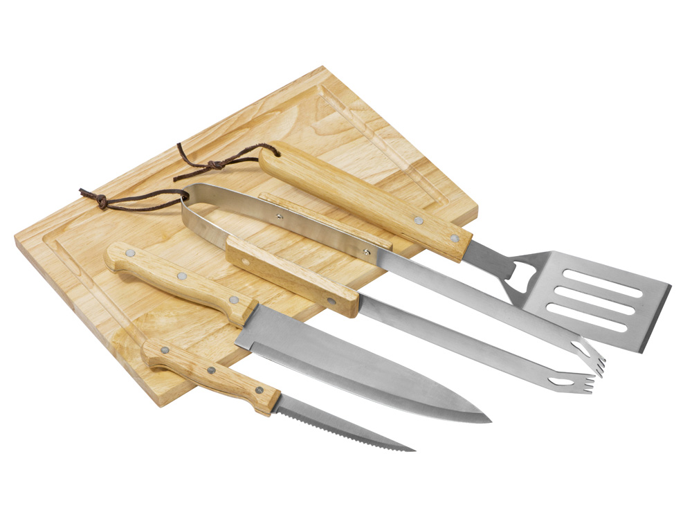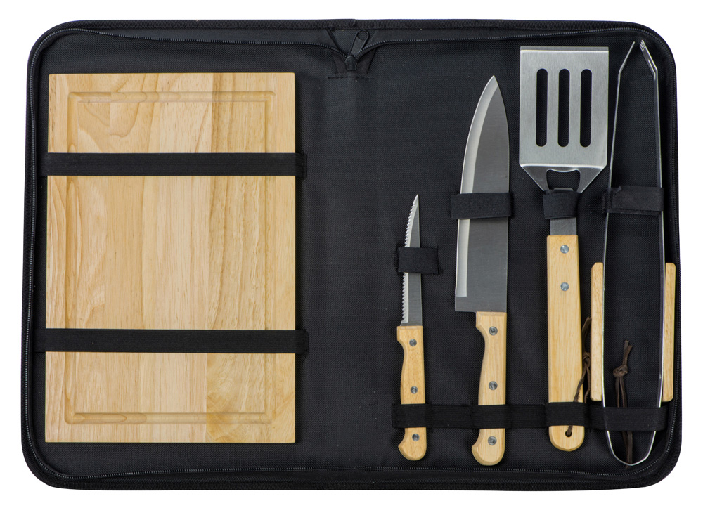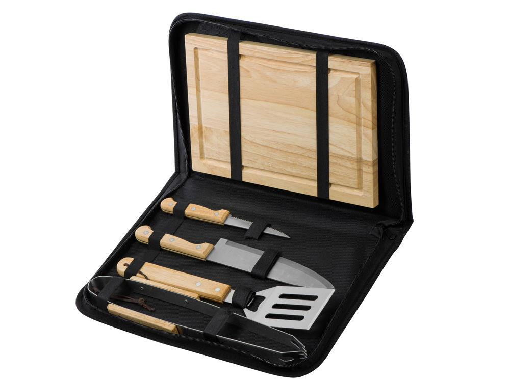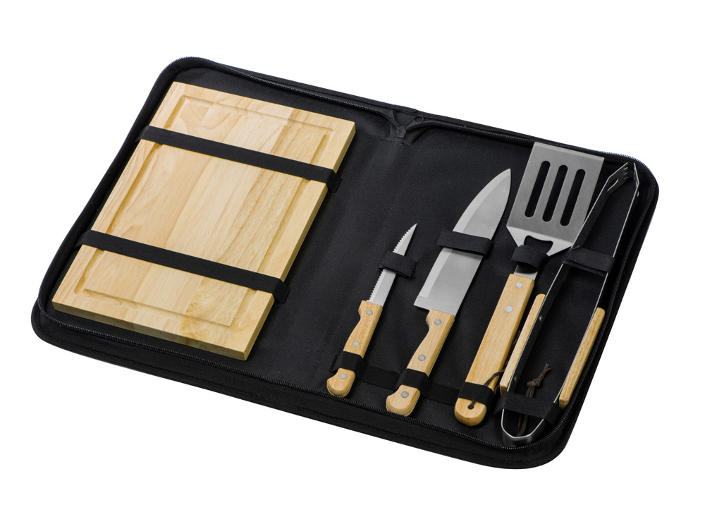 Набор из шести приспособлений для барбекю и гриля — в состав входят разделочная доска, щипцы, лопатка, нож для стейка, нож большой, а упаковывается сет в чехол из полиэстера.