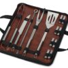 Набор для барбекю Fabrizio состоит из ножа, лопатки, вилки, щипцов, четырех шампуров и восьми вилок для кукурузы, упакованный в чехол-книжку с ручками для переноски.