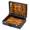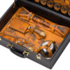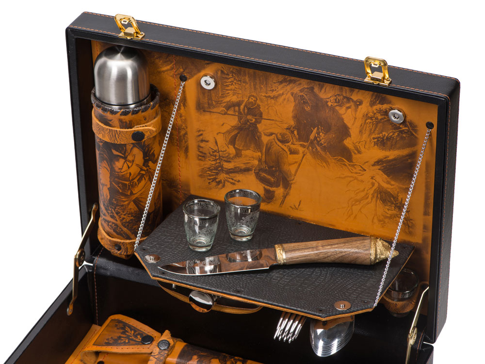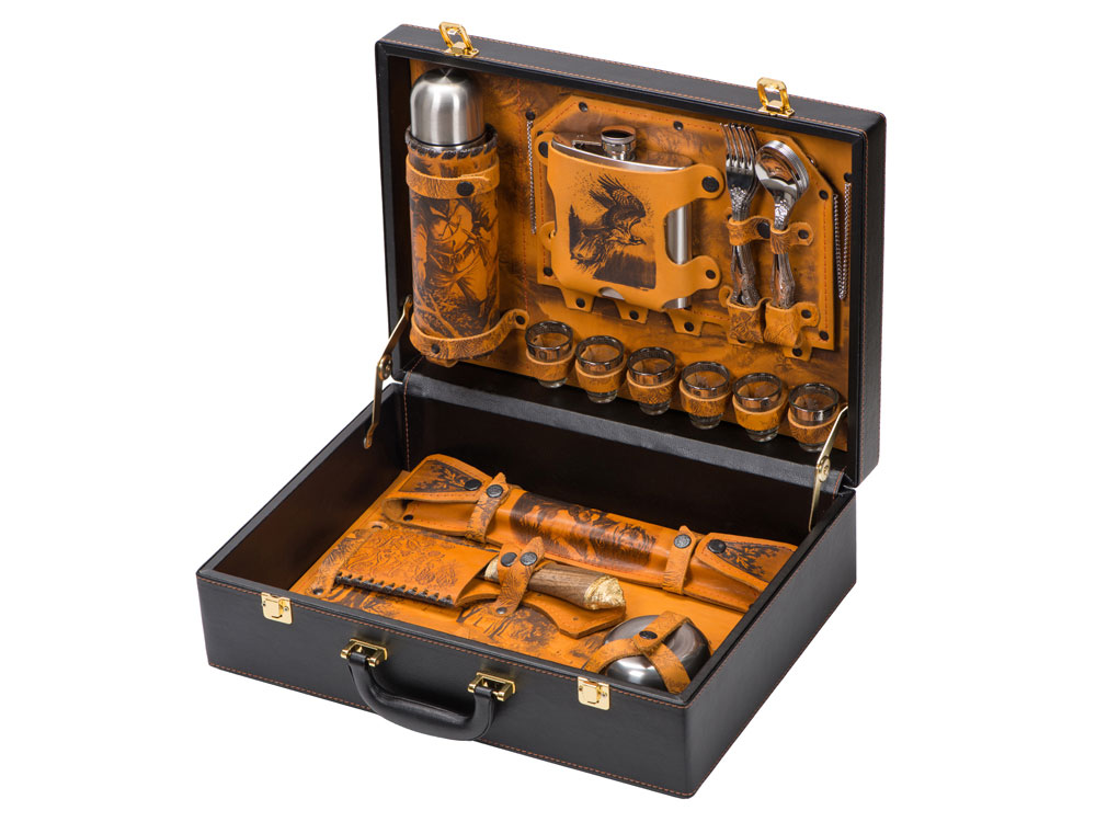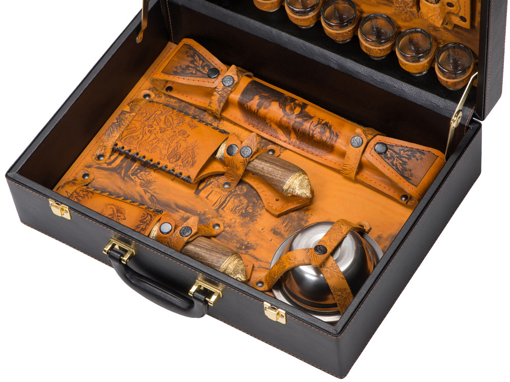 Набор Охотничий азарт. Каждый кейс изготовлен из натуральной кожи. На наружных сторонах имеется свой уникальный авторский рисунок, выполненный в технике художественного выжигания. Внутренние элементы также отделаны натуральной кожей, которая различается по цветовым решениям. Остальные предметы подарочного набора изготовлены из высококачественной нержавеющей стали. Этот подарок идеально подойдет для настоящих мужчин с характером!