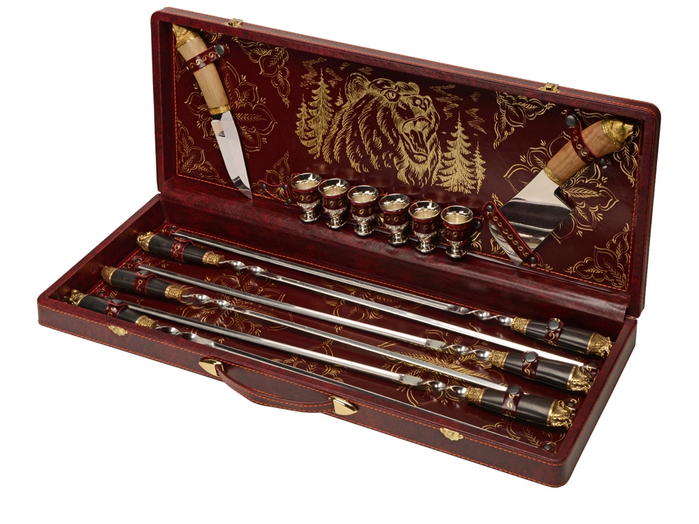 Бордовый дипломат на кодовых замках предполагает, что внутри находится что-то очень важное. Если не миллион долларов, то хотя бы ценные документы. В этом подарочном наборе вы обнаружите кое-что не менее важное, чем документы — набор для приятного времяпровождения. Стопки на 6 персон — не хватает только закуски. Закуску придется взять отдельно, порубить и поджарить на прилагаемых шампурах.