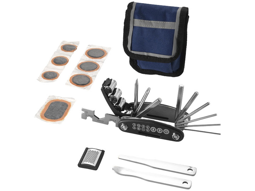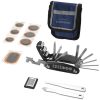 Ремкомплект для велосипеда Wheelie. Многофункциональный инструмент 15 в 1 с 2 инструментами для демонтажа шин, рашпилем, клеем и заплатками, чехлом со светоотражающей каймой и 2 ремешками с застежками на липучке для крепления к велосипеду.