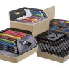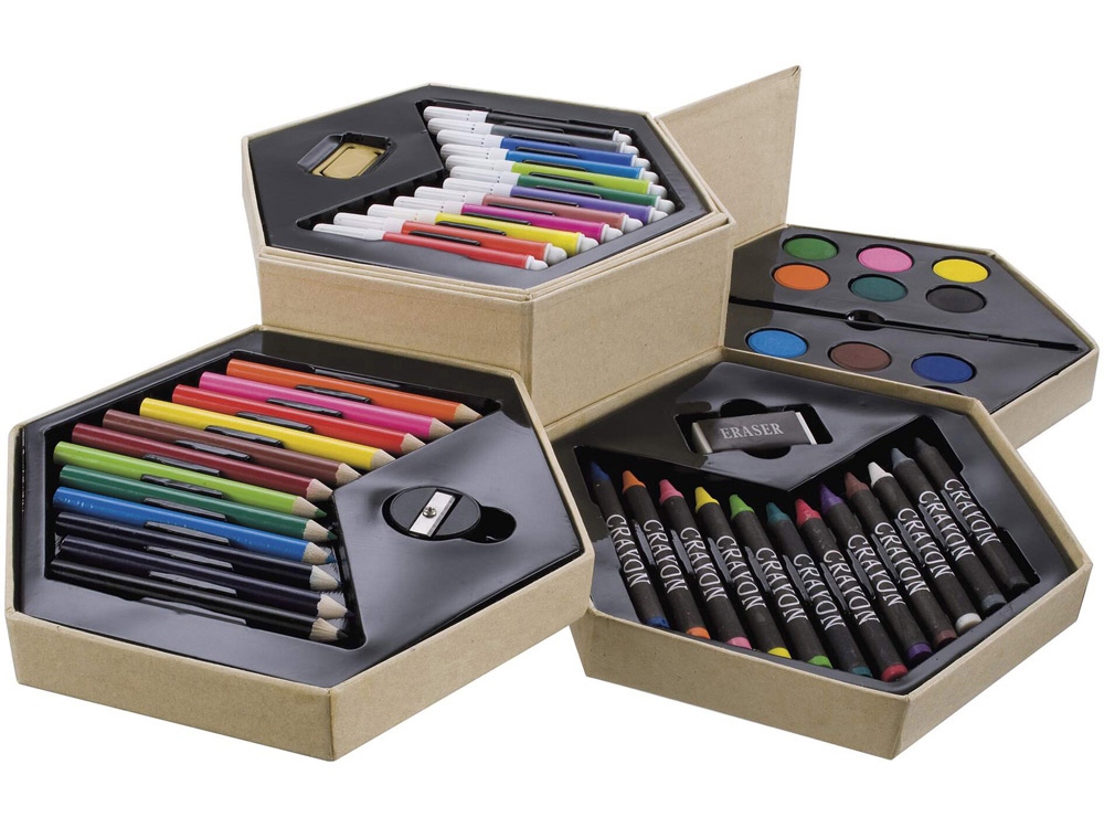 Набор из 52 предметов для рисования. 12 маркеров, 12 цветных карандашей, 12 восковых карандашей, 12 акварельных красок, кисточка, точилка, резинка и большая скрепка. Нанесение не делается на отдельные элементы набора. Картон.