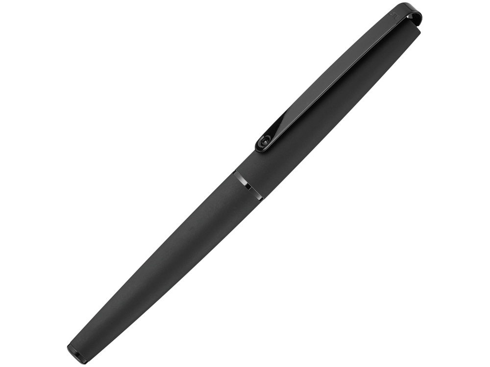 Металлическая ручка-роллер с матовым лакированным корпусом, длинным гибким металлическим клипом, декоративным кольцом и заглушкой с глянцевой отделкой в черном цвете. Рифленая зона захвата с глянцевой отделкой черного цвета.