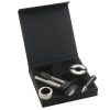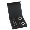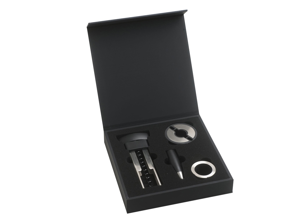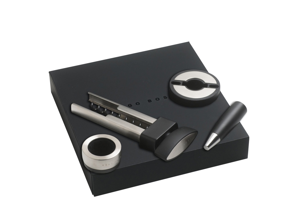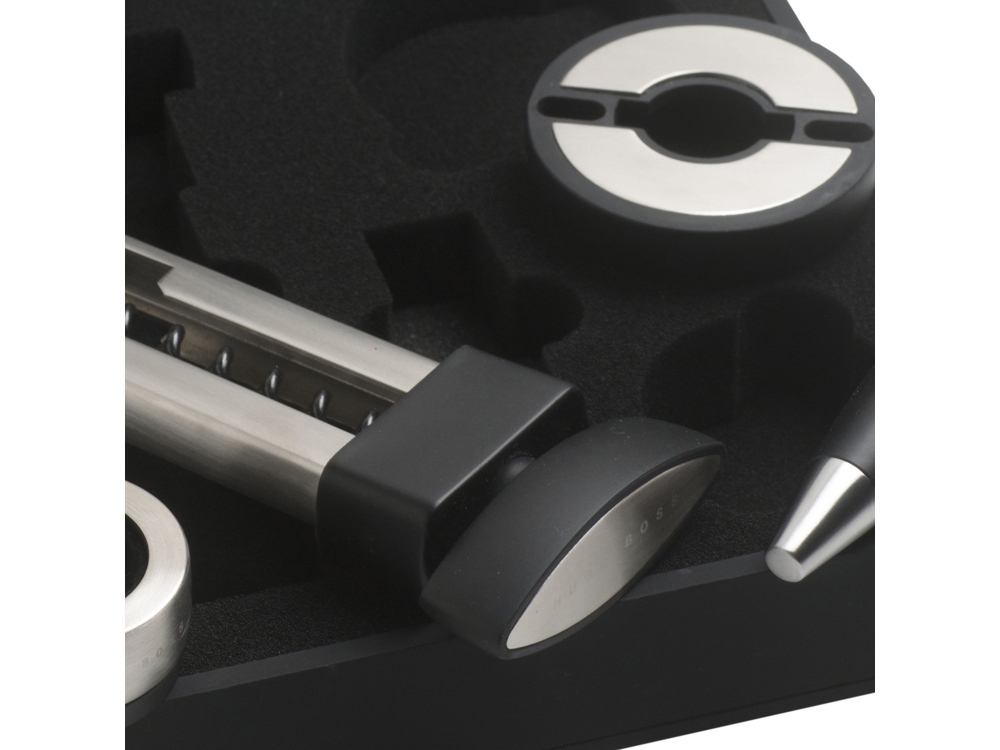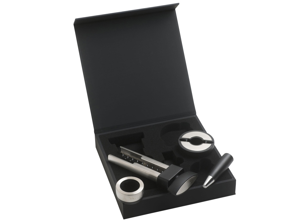 Набор для вина от Hugo Boss состоит из каплеуловителя, штопора, пробки для бутылки и ножа для фольги. Все элементы набора выполнены в стальном с черными вставками цвете и имеют вставки из силиконовой резины. Матовая текстура черных вставок кажется еще более бархатистой, оттеняемая серебристой нержавеющей сталью, из которой выполнены металлические детали элементов набора. Каждое приспособление для вина имеет логотип Hugo Boss: на пробке и ноже для фольги лого нанесено на черные вставки, а у штопора и каплеуловителя маркированы металлические детали.