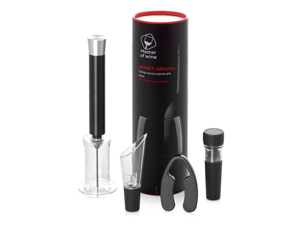 В винном наборе Pinot Grigio собрано все, что необходимо для откупоривания, подачи и длительного хранения вина. Аксессуары поставляются в эффектном красном тубусе и брендированном шубере.
