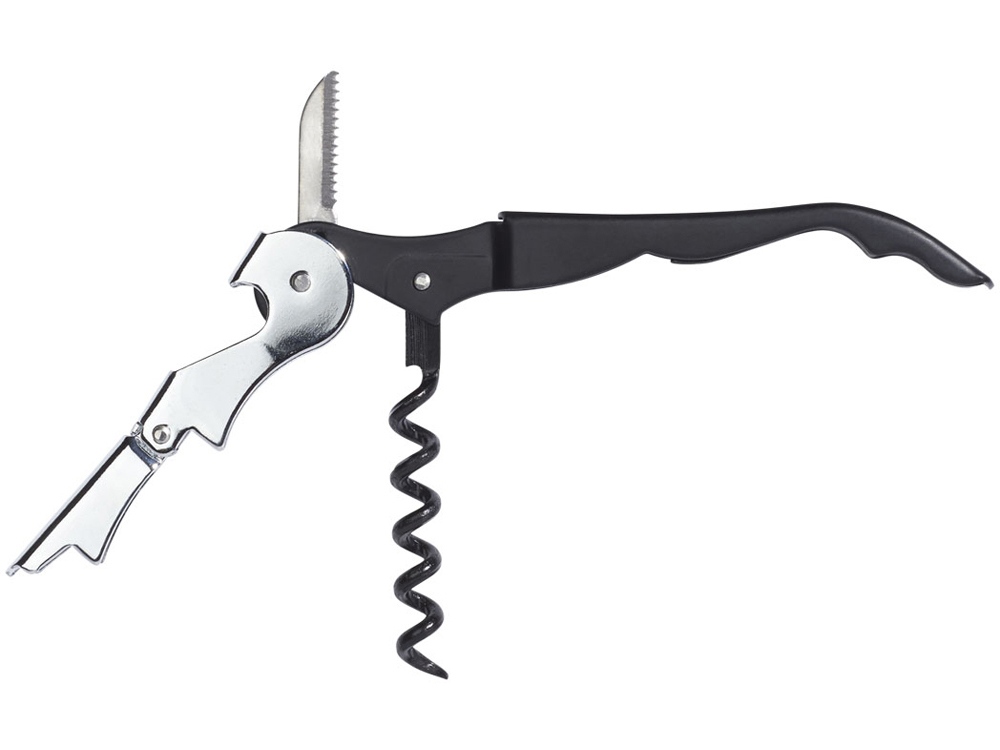 Штопор с буравчиком, открывалкой для бутылок и ножом для срезания фольги. Нержавеющая сталь.