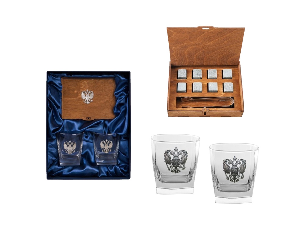 Виски сет с камнями для охлаждения РОССИЯ декорированный оловянными барельефами Герб РФ. Материал барельефов сплав на основе 95% олова(пьютер). В набор входит 2 стакана для виски емкостью 300 мл и деревянная коробочка с камнями для виски и щипцами.