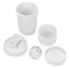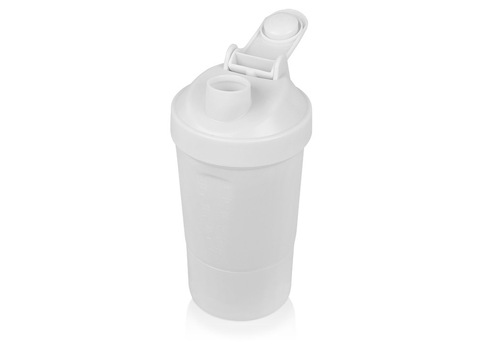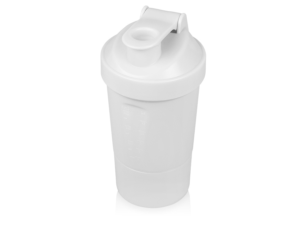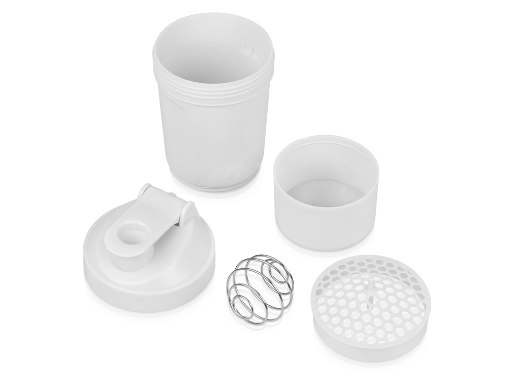 Шейкер для спортивного питания — это один из необходимых аксессуаров для спортсменов и людей, ведущих активный образ жизни. В нем можно приготовить протеиновый коктейль или фруктовый напиток. Шейкер классической формы, он удобно лежит в руке, к донышку прикручивается емкость для смешивания (таблетница), в которой можно хранить спортивные добавки: протеиновый порошок, витамины и другие концентраты. Внутри колбы имеется пластиковая сетка, чтобы процеживать спортивный напиток, а также металлический размешиватель, который растворяет порошок в напитке без комочков. Объем — 400мл. Шейкер изготовлен из пищевого пластика, он герметичен и легко моется.