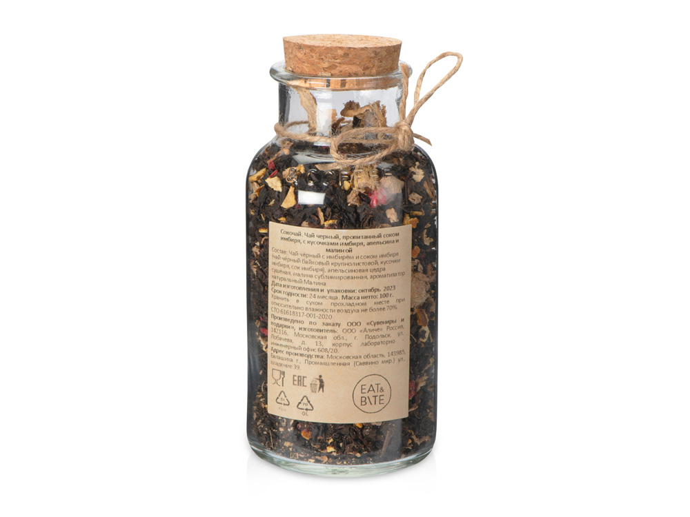 Состав: чай чёрный с имбирём и соком имбиря (чай чёрный байховый крупнолистовой, кусочки имбиря, сок имбиря), апельсиновая цедра сушёная, малина сублимированная, ароматизатор натуральный Малина.