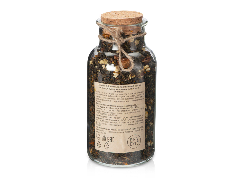 Состав: чай зелёный с ананасом и соком ананаса (чай зелёный байховый крупнолистовой, кусочки ананаса, сок ананаса), яблоко сушеное, облепиха сублимированная, ароматизатор натуральный Яблоко.