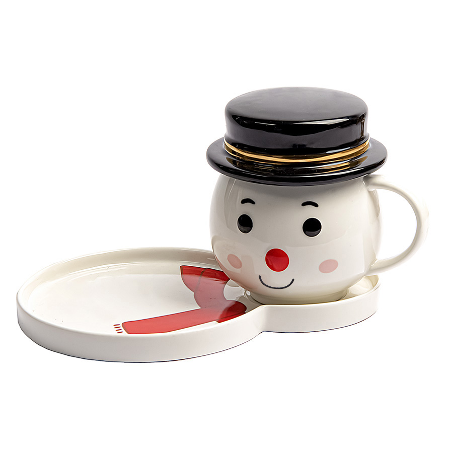 По-настоящему новогодняя чайная пара Снеговик!Кружка обтекаемой формы с крышкой в виде шляпы.Крышку можно использовать для конфет или чайных пакетиков, плюс она точно не даст остыть вашему напитку.Вместительное блюдце, на которое можно положить круассан или любимое пирожное.Такой подарок совершенно точно завоюет внимание и любовь того, кому его подарят!Индивидуальная упаковка из крафтового картона