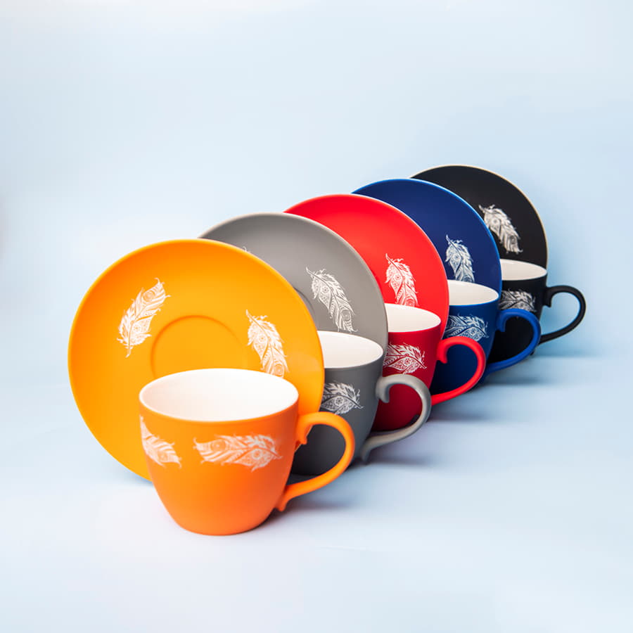 Чайная пара из фарфора с прорезиненным покрытием soft-touchЧашка классической формы и удобное глубокое блюдцеНе рекомендуется мыть в посудомоечной машине