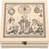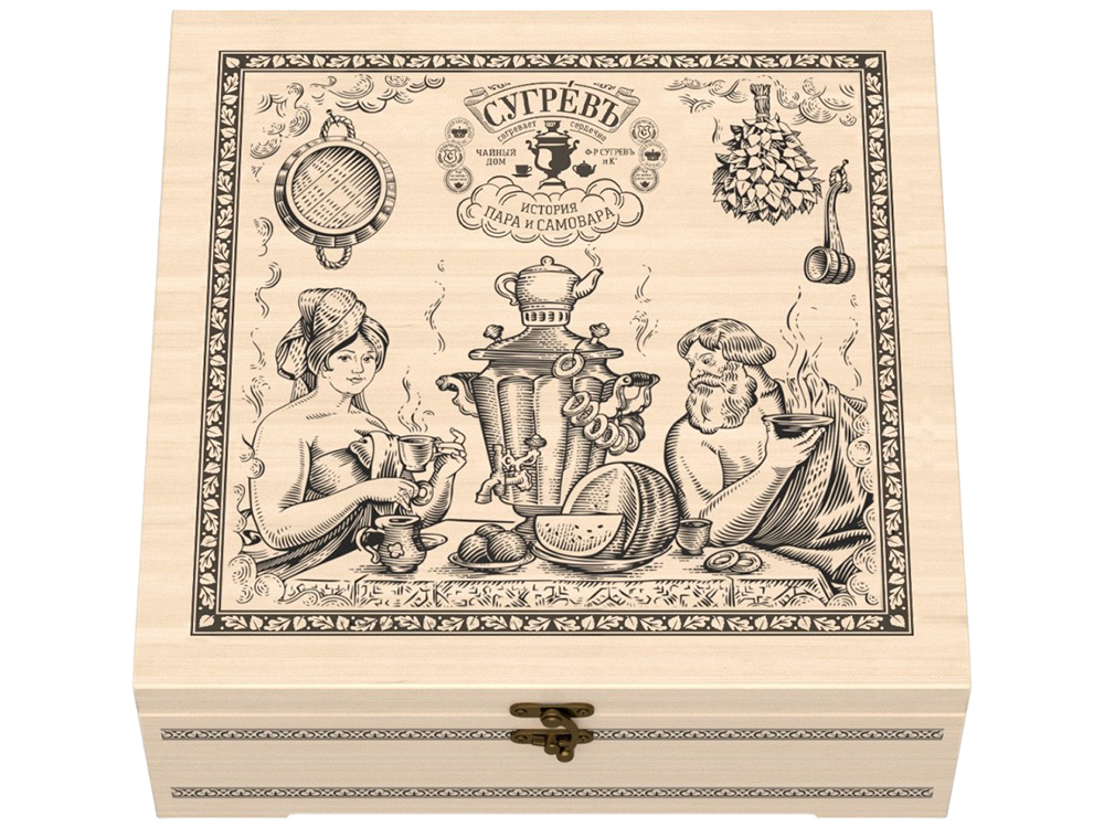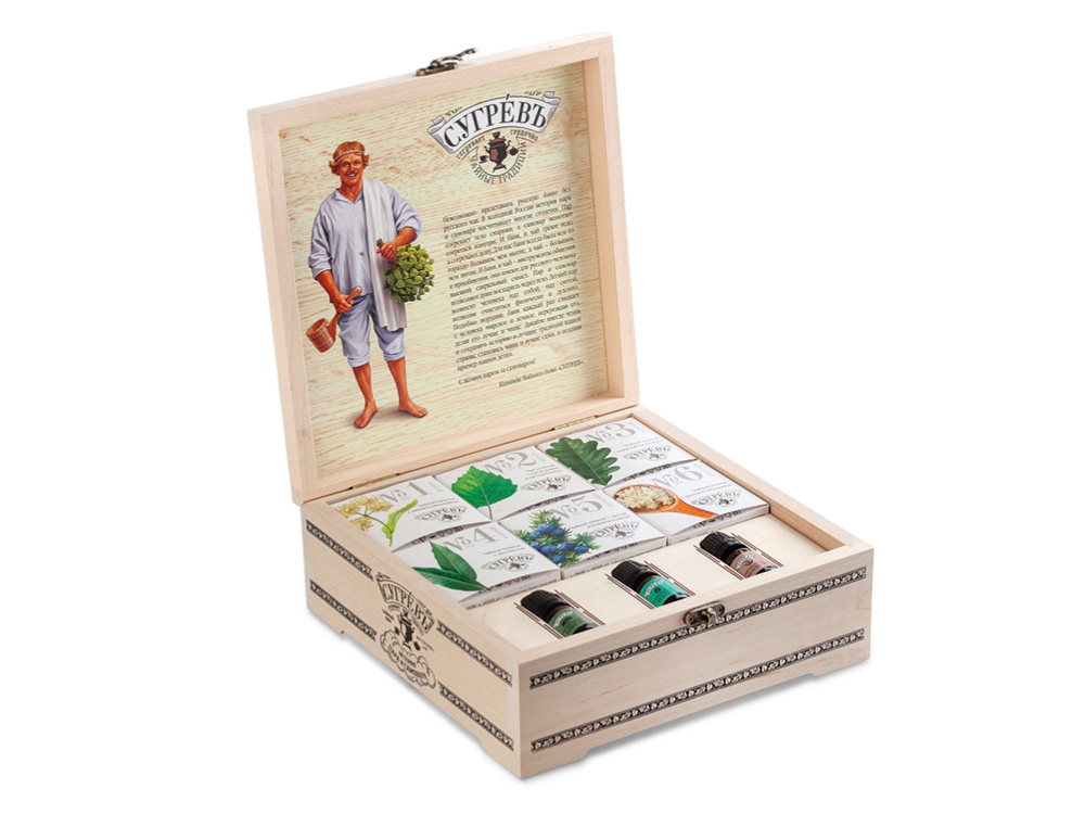 Подарочный набор для бани представляет собой сувенирную деревянную шкатулку из массива берёзы, посвящённую истории бани и банного чаепития.