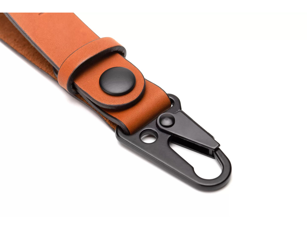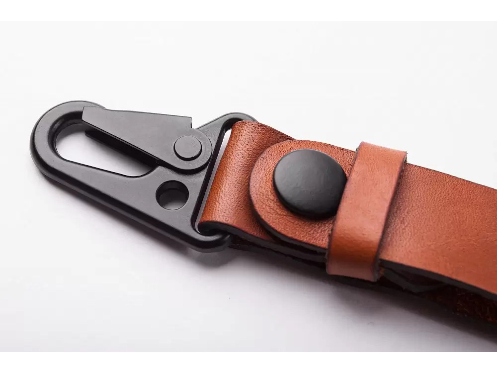 Ремешок сшит из прочной кожи коричневого цвета. Оборудован надёжным металлическим карабином, самопроизвольное расцепление которого невозможно. Ключи, прицепленные к нему, обречены вечно храниться в глубинах сумки или кармана джинсов, и у них нет ни единого шанса потеряться. Прицепить ремешок можно к шлёвке джинсов или к куртке.