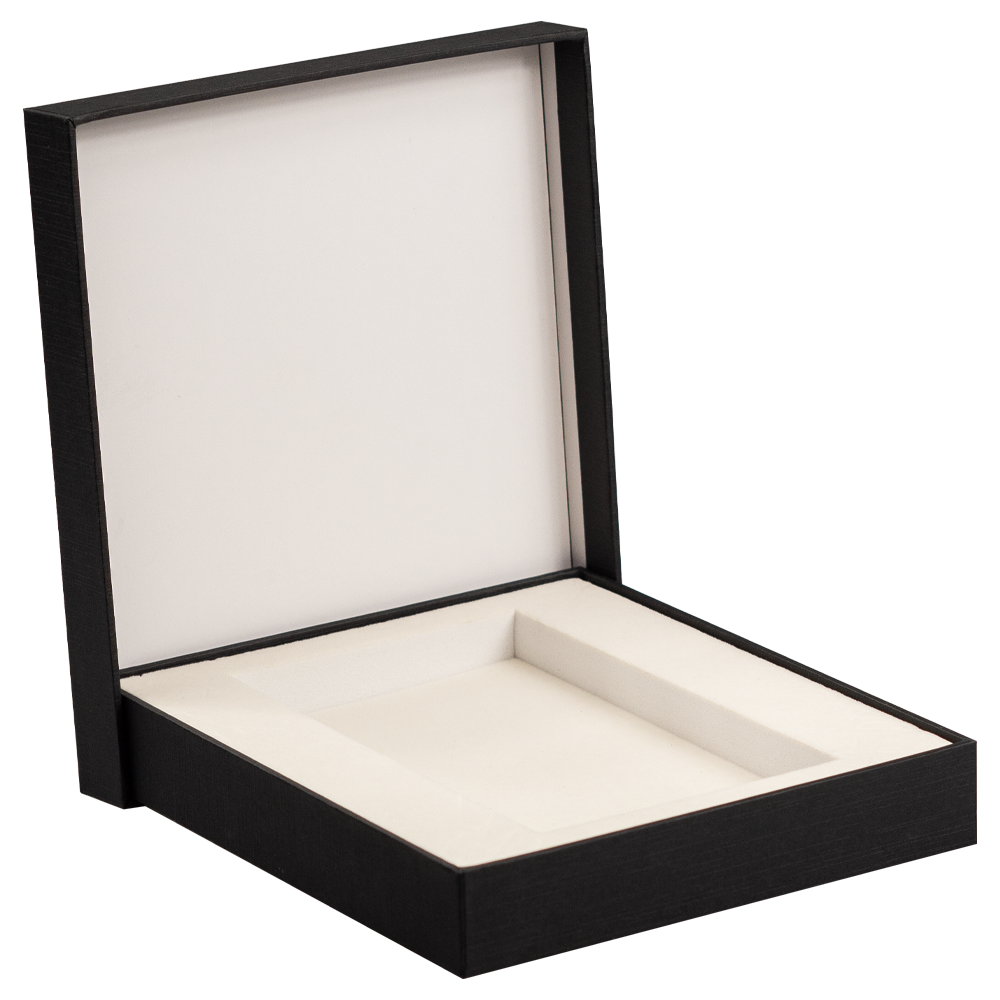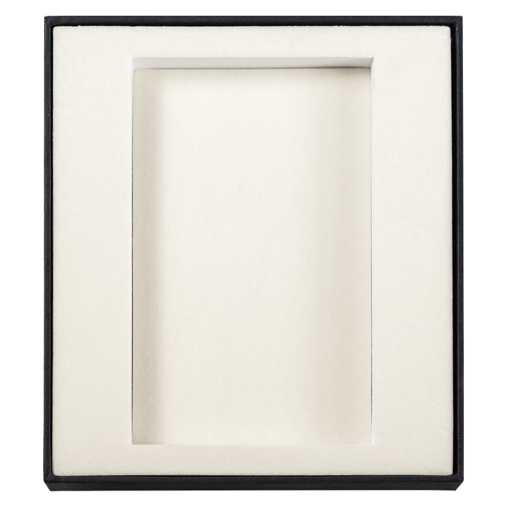 Коробка крышка/дно. С EVA ложементом. Материал коробки: формованный мелованный картон, толщина стенок 2 мм, кашированный дизайнерской однотонной бумагой. Материал ложемента: EVA, цвет бежевый, покрытие флок цвет бежевый. Вырубка ложемента согласно имеющихся форм. Возможна индивидуальная вырубка по согласованию с поставщиком.