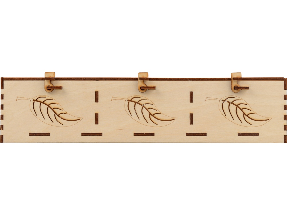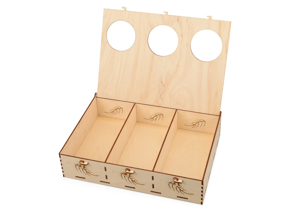 Подарочная коробка из трех секций, украшенная экопринтом в виде листа растения. В крышке над каждой из секций есть отверстие, чтобы можно было рассмотреть содержимое. Коробка выполнена из березовой фанеры и отлично гармонирует с наполнителем из крафтовой бумаги. Хотите нестандартно украсить подарок? Упакуйте его в подарочную коробку Лист, она сохранит его содержимое в целости и сохранности.