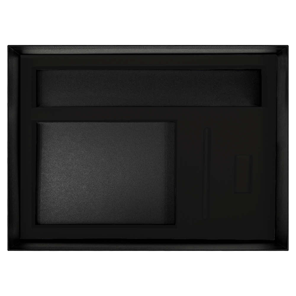Подарочная коробка Solution Prestige с магнитным клапаном изготовлена из переплетного картона, снаружи кашированного дизайнерской бумагой фактурой имитирующей лен. Ложемент черного цвета с вырубкой. Материал: флокированная пена EVA.