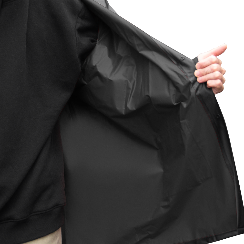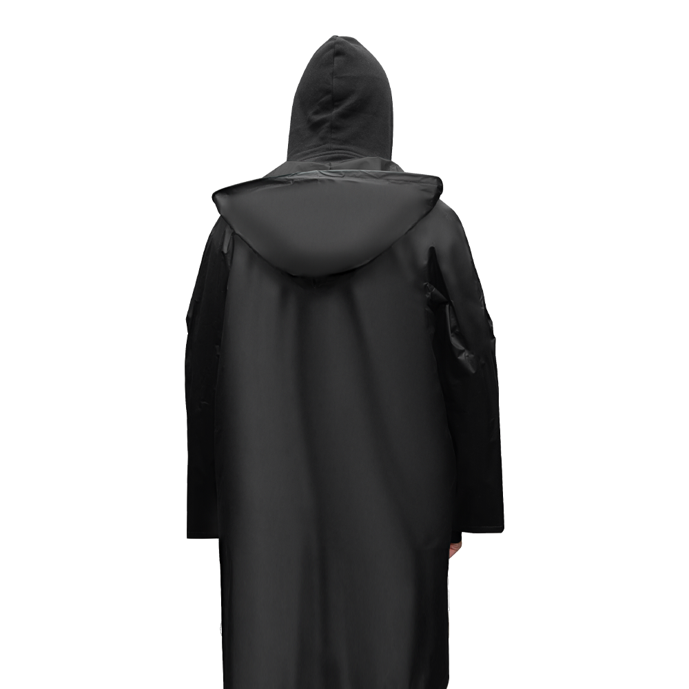 Практичный дождевик из водонепроницаемого PVC с контрастным двухцветным дизайном. Оснащён капюшоном с утягивающими шнурами, двумя накладными карманами и застёжкой на кнопках. Лёгкий, компактный и удобный в носке.