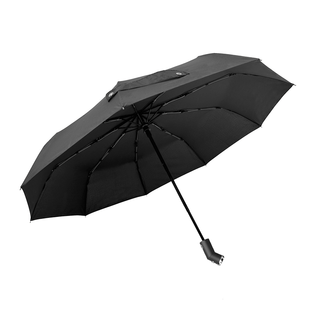 Ручка зонта в зоне держания рукой выполнена из пластика с покрытием софт тач, имеет удобный ремешок на руку. А так же оснащена фонариком.